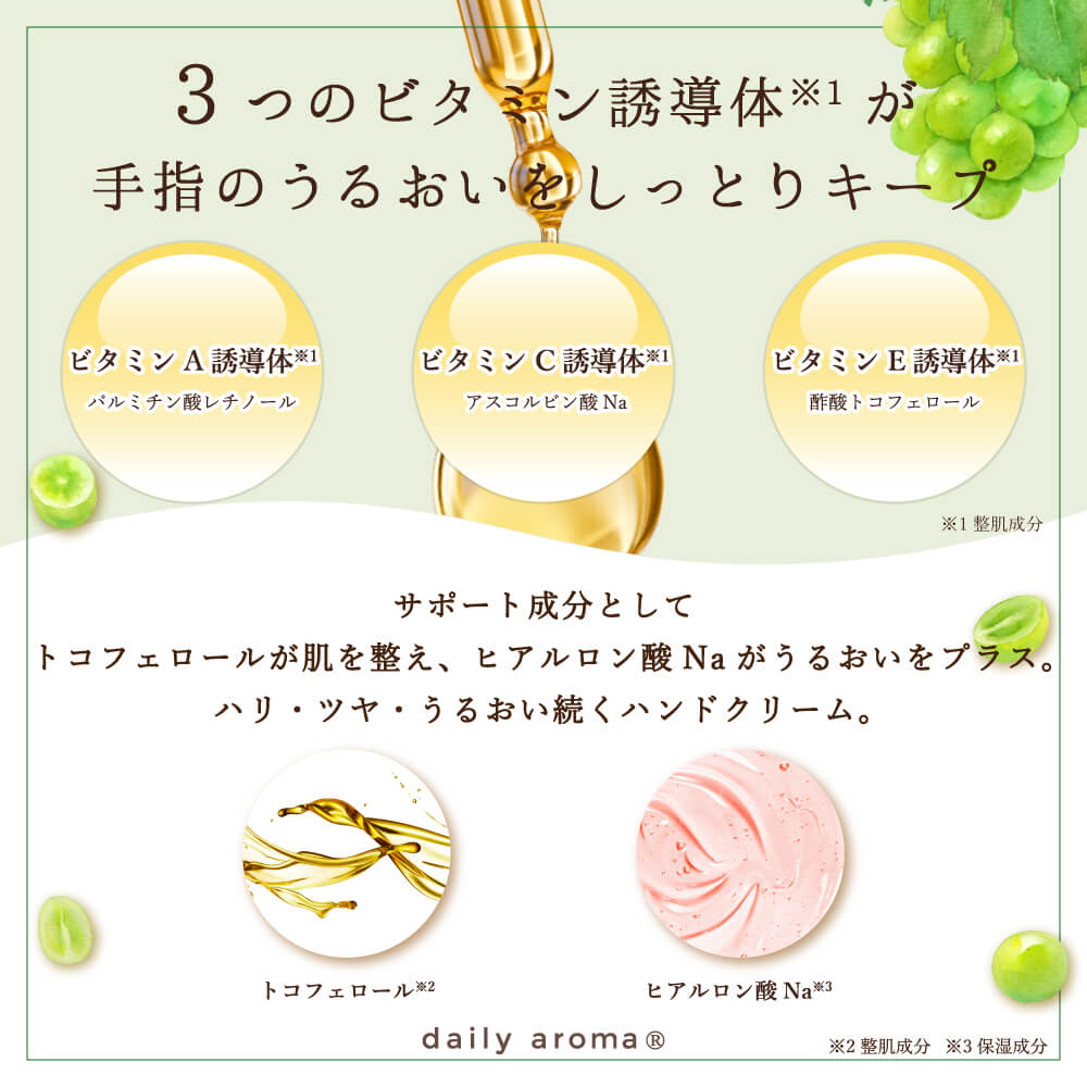 さらに新たにビタミン誘導体※2を加え、手肌をすこやかに整える処方へ。しっとりとしたうるおいを保ちながら、みずみずしいマスカットの香りが広がります。