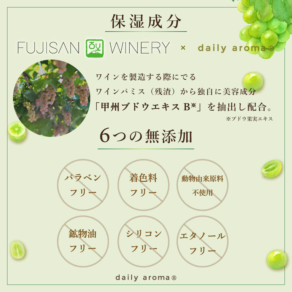 富士山に一番近いと称される「富士山ワイナリー」。自然豊かなこのワイナリーで育った「甲州ブドウ」からワインを製造する際にでるワインパミス(残渣)から独自に美容成分「甲州ブドウエキス*」を抽出配合。
