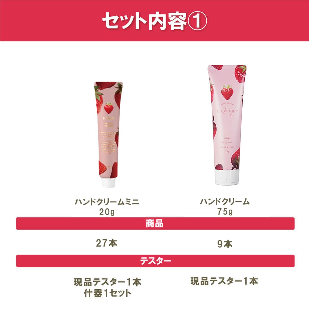 甘酸っぱい自然ないちごの香りの【いちご】シリーズが新発売のハンドクリーム75gを含むテスター・什器付きでお得にまとめてご購入いただけます。