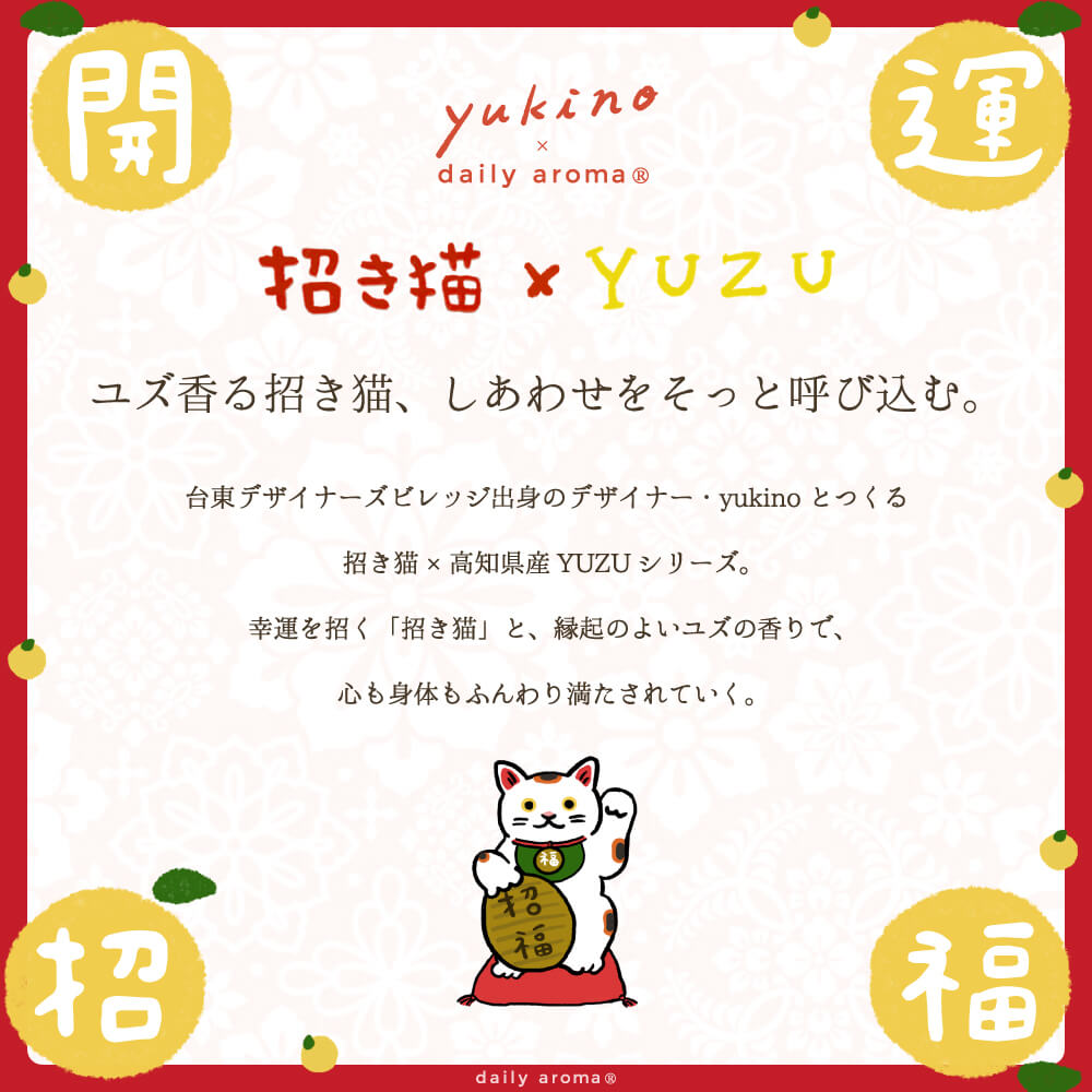 台東デザイナービレッジ出身デザイナーのyukinoによる招き猫×ユズの香りのシリーズ。