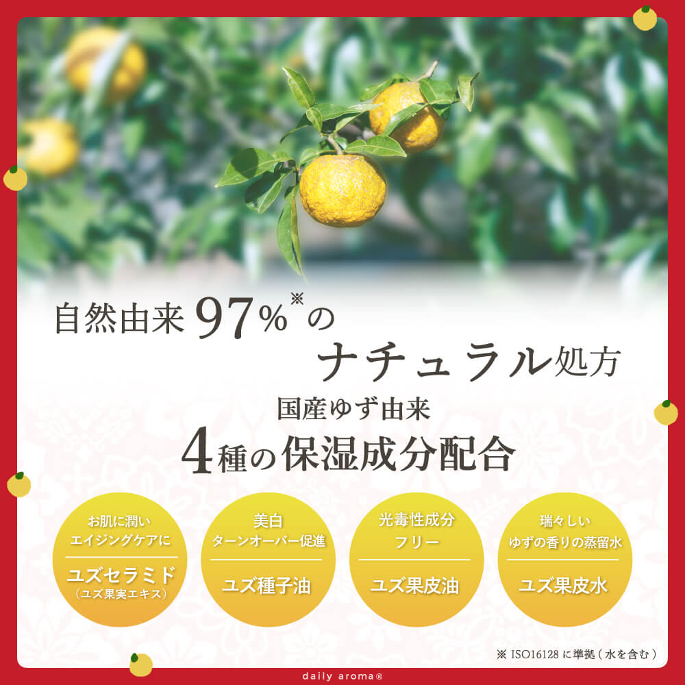 水、ヒマシ油、グリセリン、シア脂、セタノール、ユズ果皮水、(アクリル酸ヒドロキシエチル/アクリロイルジメチルタウリンNa)コポリマー、ユズ種子油、ユズ果皮油、ユズ果実エキス、オリーブ果実油、プロパンジオール、ステアリン酸グリセリル(SE)、リンゴ酸ジイソステアリル、イソステアリン酸ソルビタン、ポリソルベート60、1,2-ヘキサンジオール、ブチルカルバミン酸ヨウ化プロピニル、BG