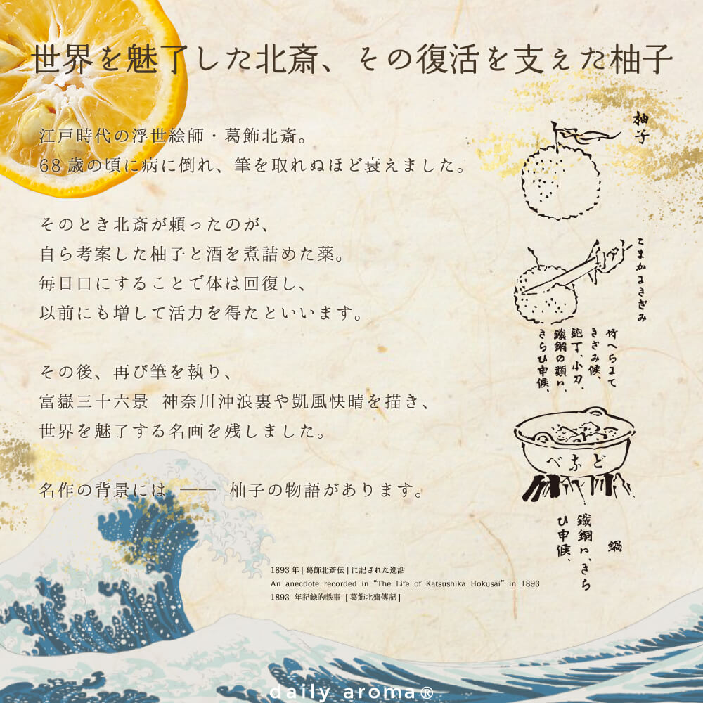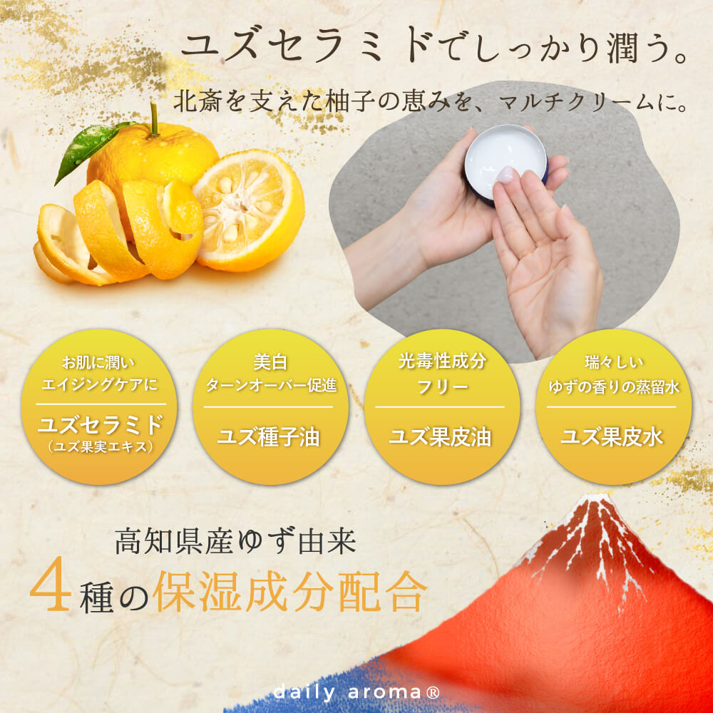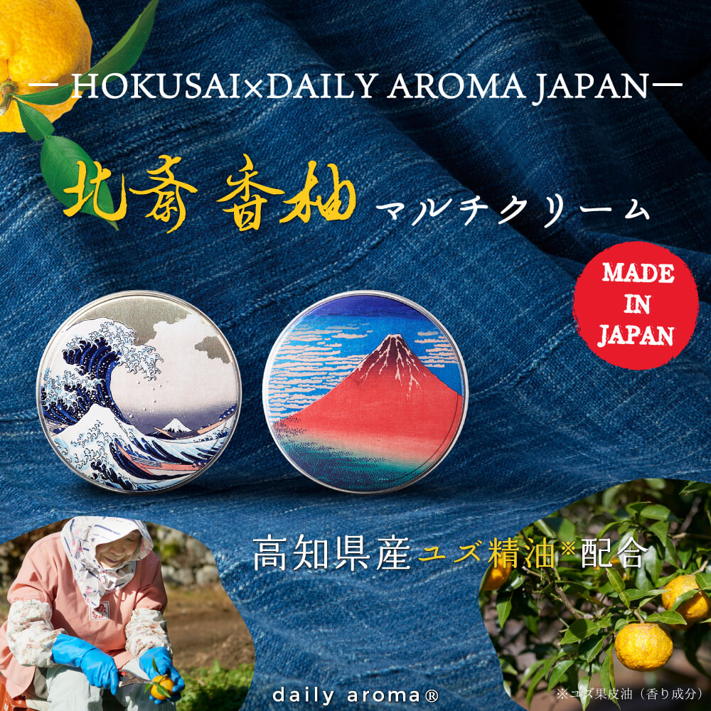 北斎の美、ユズの香り。ひと塗りで広がる贅沢なひととき。北斎の洗練された美しさをパッケージに、もぎたてのユズの香りをたっぷりと閉じ込めました。するっとなじみ、ふんわり広がる心地よい香り。ユズセラミド※がお肌をうるおしながら、日本の美を感じるスキンケアを。