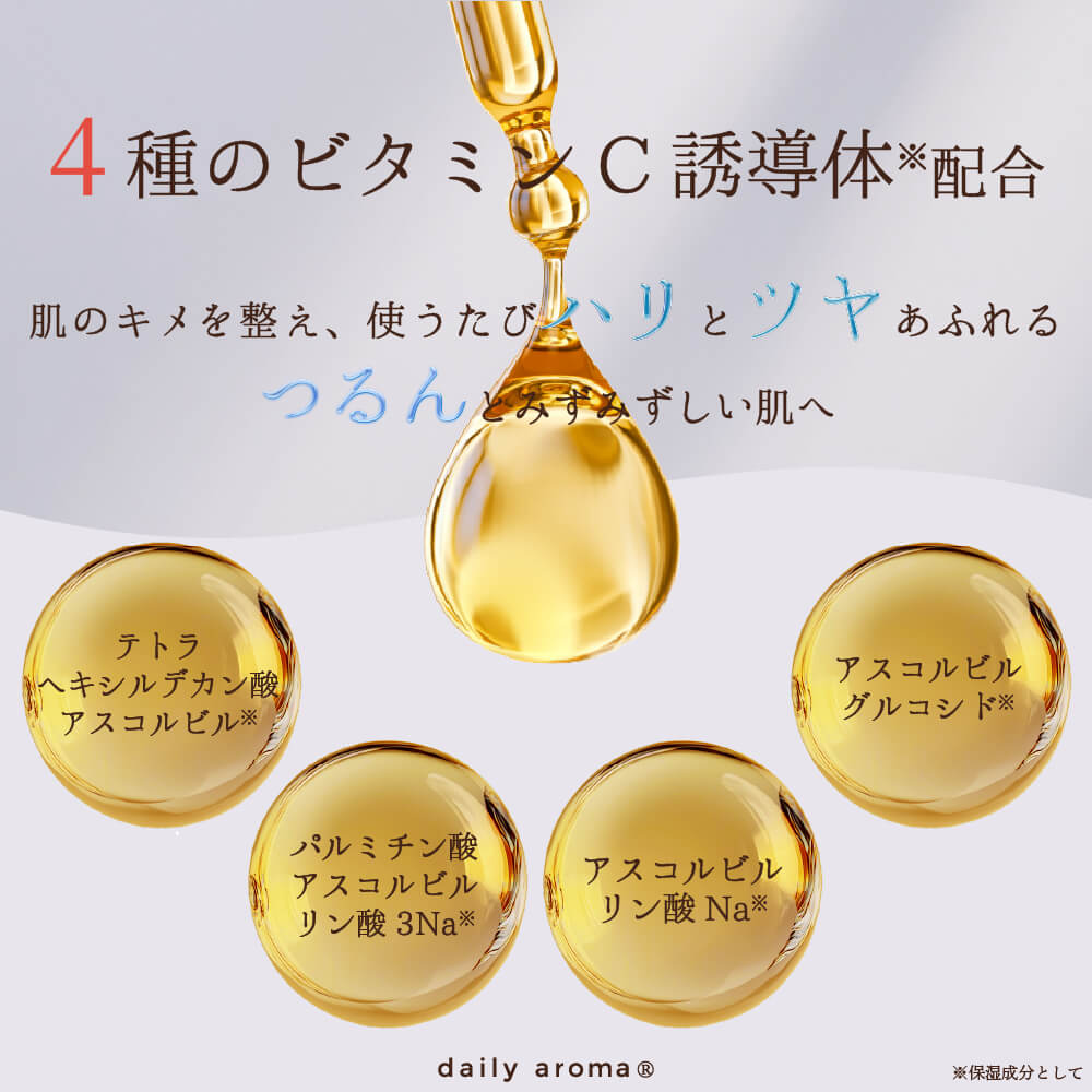 水、DPG、グリセリン、ブドウ果実エキス、ブドウ葉エキス、アスコルビルグルコシド、アスコルビルリン酸Na、パルミチン酸アスコルビルリン酸3Na、テトラヘキシルデカン酸アスコルビル、ヒアルロン酸Na、加水分解コラーゲン、香料、エチルヘキシルグリセリン、ヒドロキシアセトフェノン、トリプロピレングリコール、キサンタンガム、クエン酸、クエン酸Na、PEG-60水添ヒマシ油、エチドロン酸、BG
