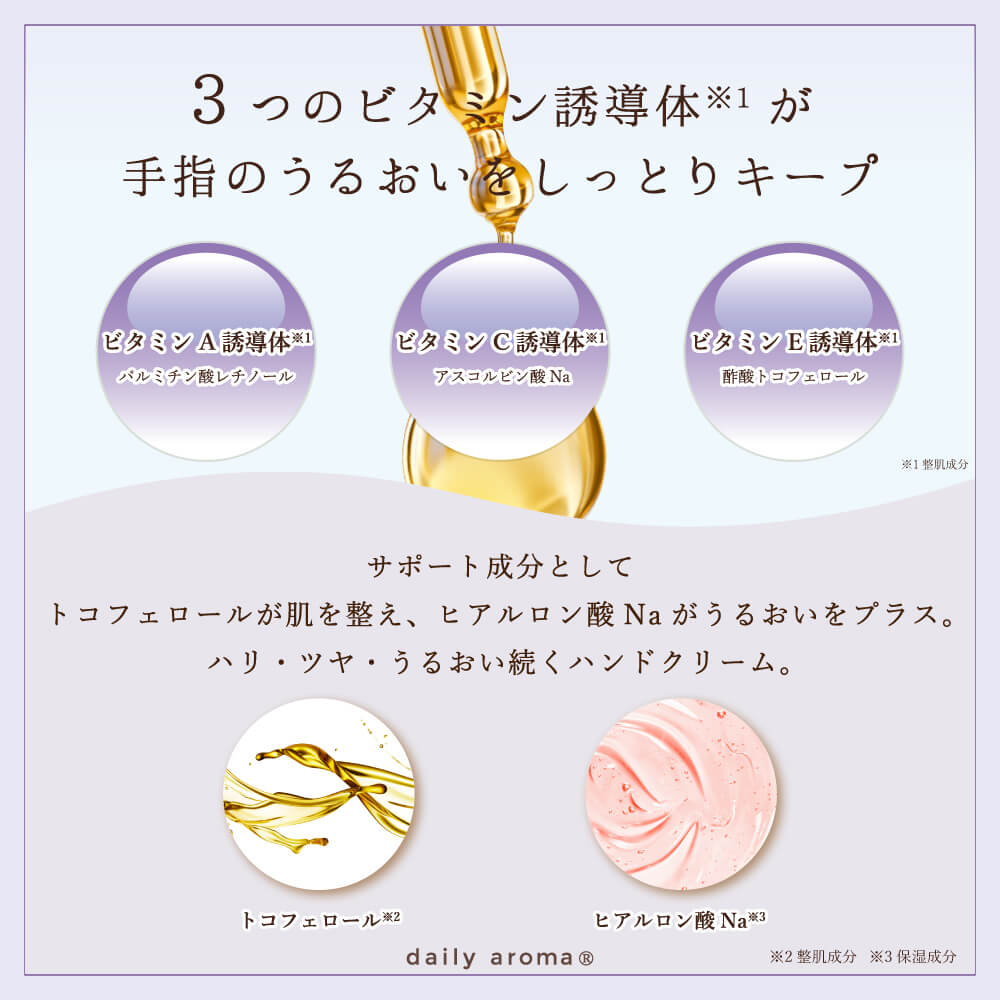 国産ぶどうポリフェノール※1とシアバター※2 そして2つのビタミン誘導体※3 が手指のうるおいをしっとりキープ。巨峰のジューシーな甘い香りが広がります。